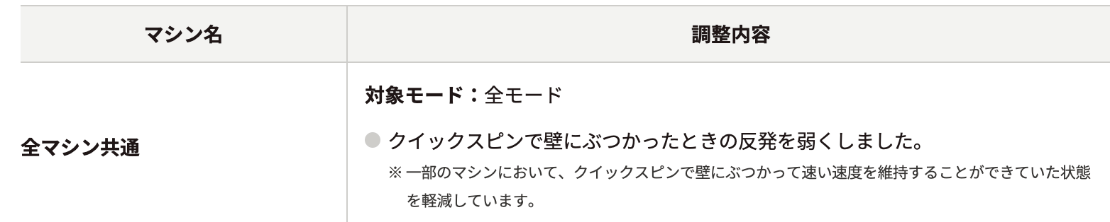 クイックスピンで壁にぶつかったときの反発を弱くしました。一部のマシンにおいて、クイックスピンで壁にぶつかって速い速度を維持することができていた状態を軽減しています。